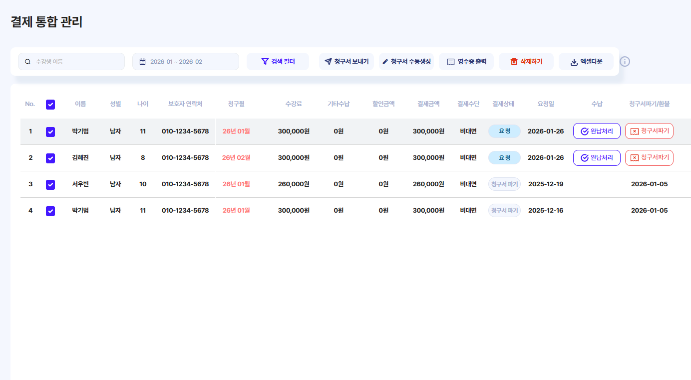 수강생 또는 학부모님께 실시간 카카오 청구서 발송
